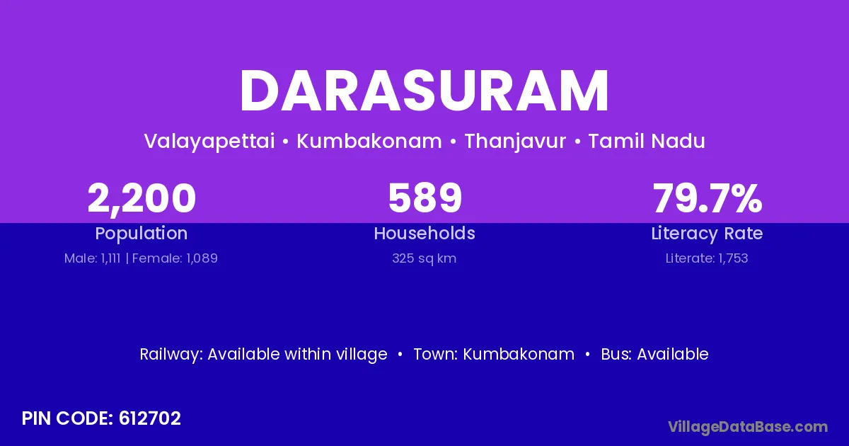 Darasuram village has a total population of 2,200 people, of which 1,111 are males and 1,089 are females.