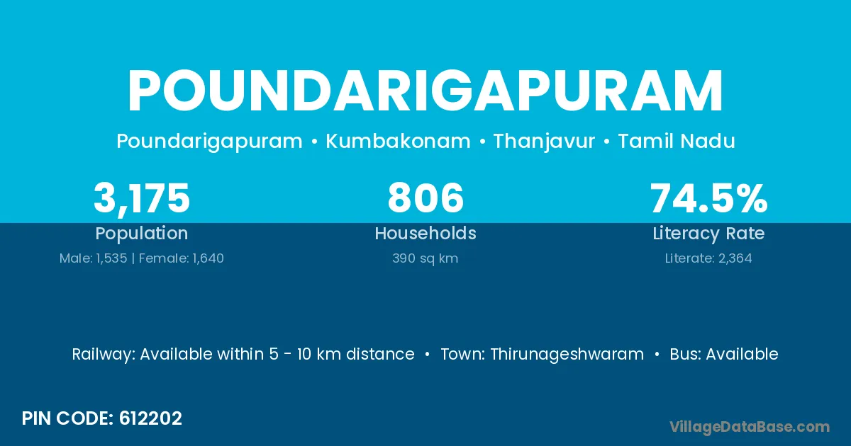 Thirunageshwaram is the nearest town to Poundarigapuram village for major economic activities