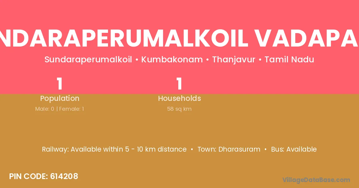 Sundaraperumalkoil Vadapathi village has a total population of 1 people, of which 0 are males and 1 are females.