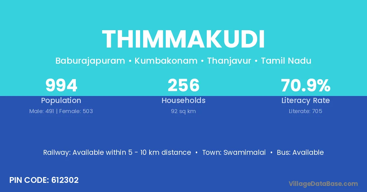 Thimmakudi village has a total population of 994 people, of which 491 are males and 503 are females.
