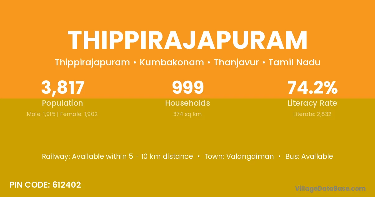 Thippirajapuram village has a total population of 3,817 people, of which 1,915 are males and 1,902 are females.