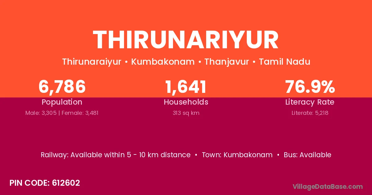Thirunariyur village has a total population of 6,786 people, of which 3,305 are males and 3,481 are females.