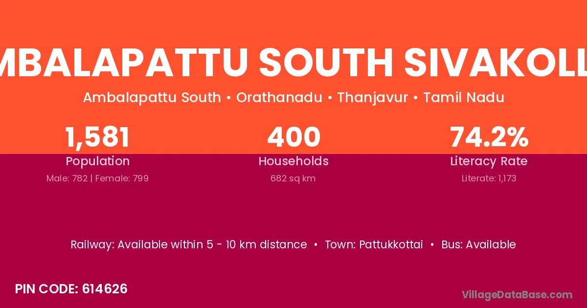 Ambalapattu South Sivakollai village has a total population of 1,581 people, of which 782 are males and 799 are females.