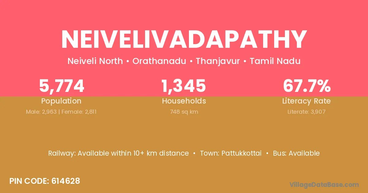 Neivelivadapathy village has a total population of 5,774 people, of which 2,963 are males and 2,811 are females.