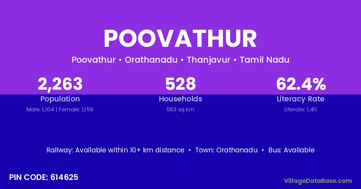 Poovathur village has a total population of 2,263 people, of which 1,104 are males and 1,159 are females.