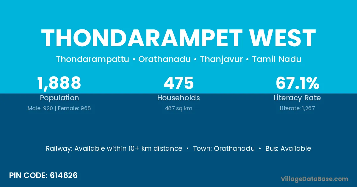 Thondarampet West village has a total population of 1,888 people, of which 920 are males and 968 are females.