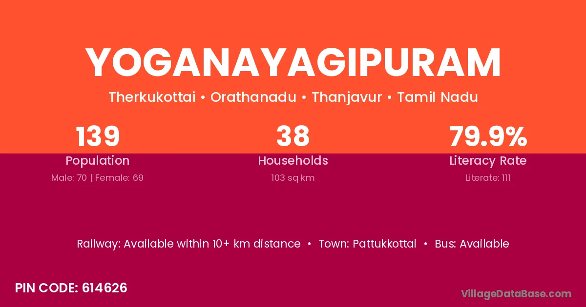 Yoganayagipuram village has a total population of 139 people, of which 70 are males and 69 are females.