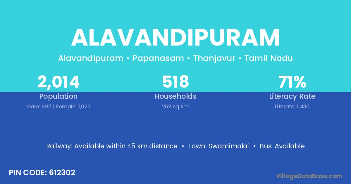 Swamimalai is the nearest town to Alavandipuram village for major economic activities