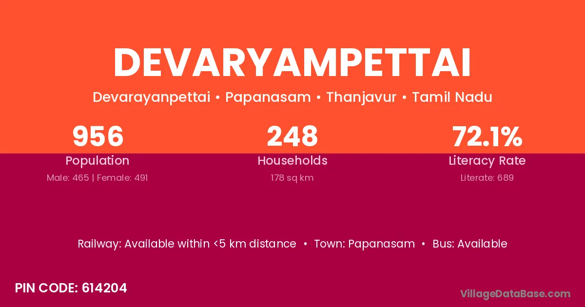 Devaryampettai village has a total population of 956 people, of which 465 are males and 491 are females.
