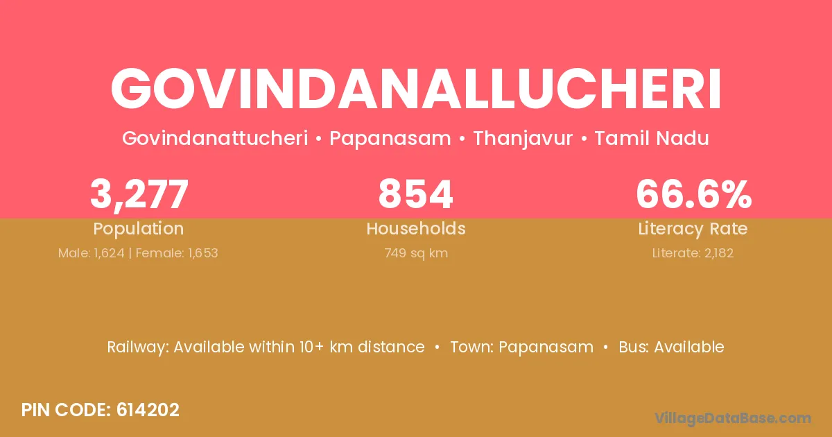 Govindanallucheri village has a total population of 3,277 people, of which 1,624 are males and 1,653 are females.