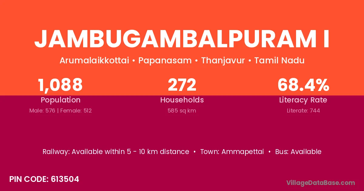 Jambugambalpuram I village has a total population of 1,088 people, of which 576 are males and 512 are females.