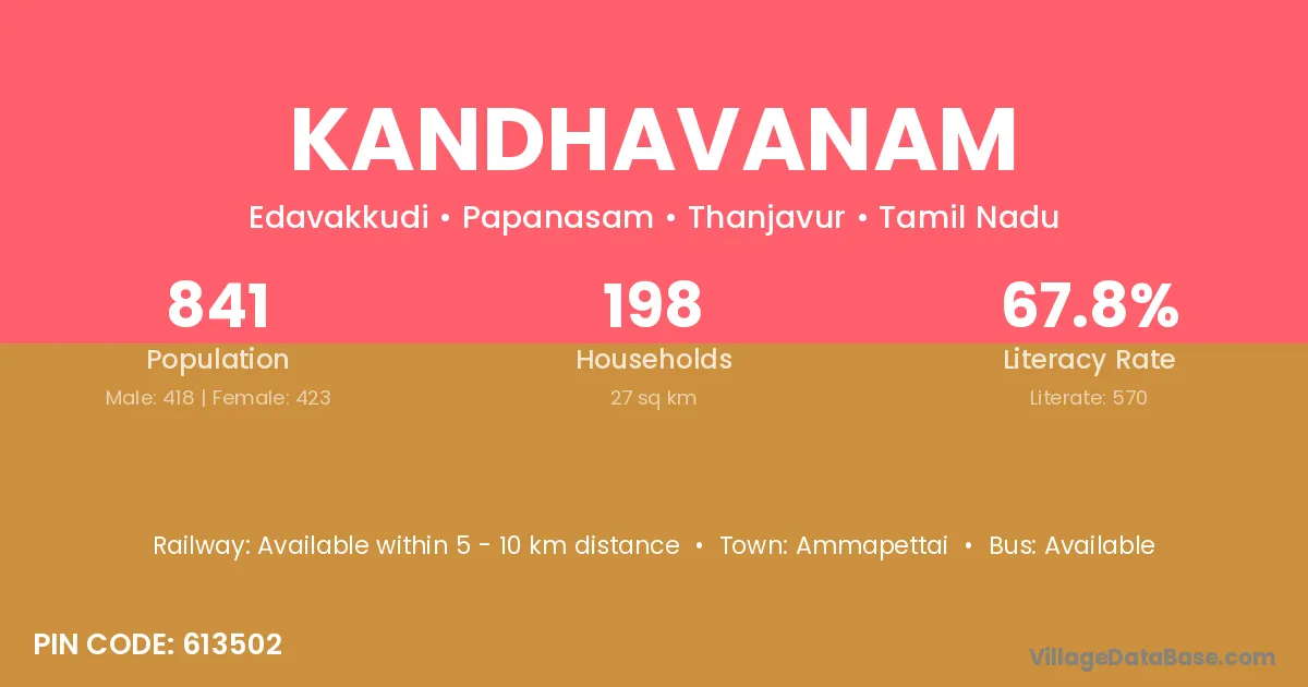 Kandhavanam village has a total population of 841 people, of which 418 are males and 423 are females.