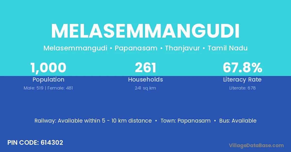 Melasemmangudi village has a total population of 1,000 people, of which 519 are males and 481 are females.
