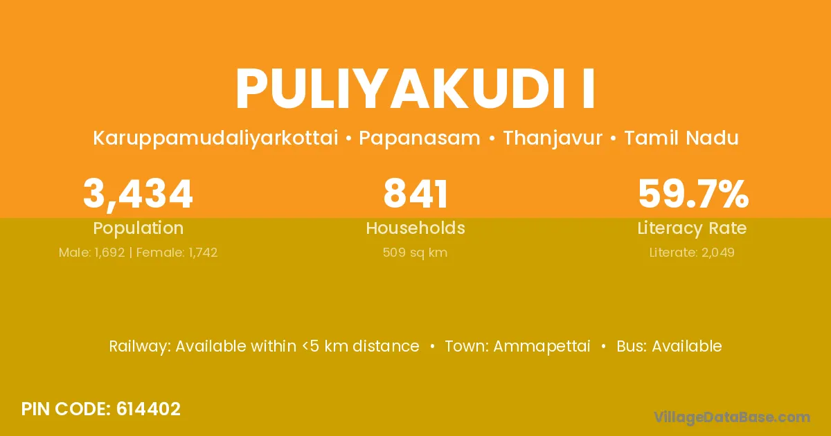 Puliyakudi I village has a total population of 3,434 people, of which 1,692 are males and 1,742 are females.