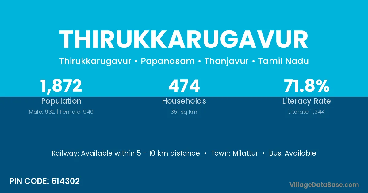 Thirukkarugavur village has a total population of 1,872 people, of which 932 are males and 940 are females.