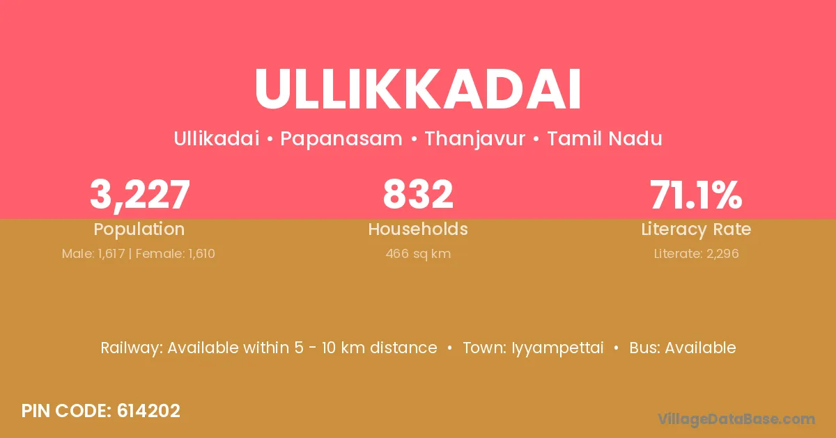 Ullikkadai village has a total population of 3,227 people, of which 1,617 are males and 1,610 are females.