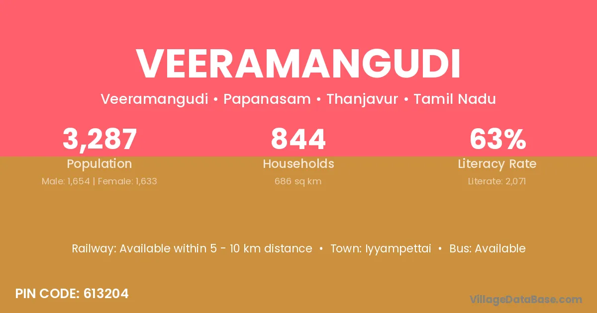Veeramangudi village has a total population of 3,287 people, of which 1,654 are males and 1,633 are females.
