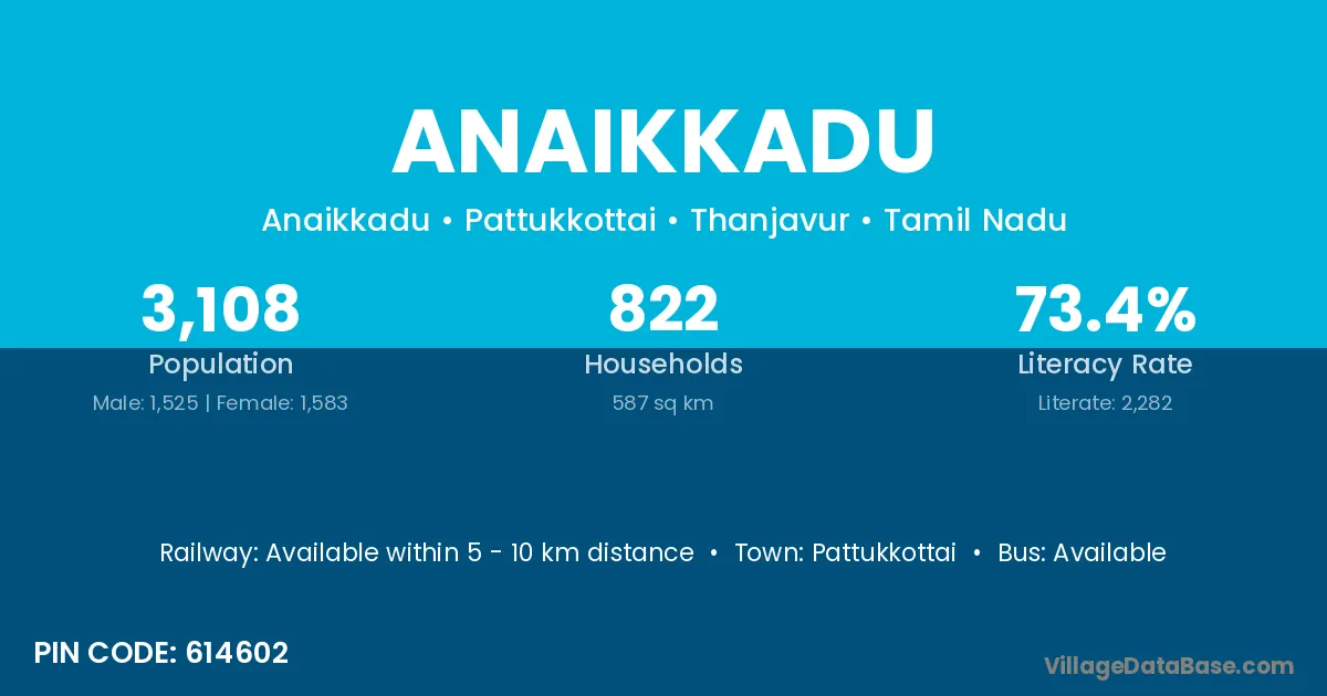 Anaikkadu village has a total population of 3,108 people, of which 1,525 are males and 1,583 are females.