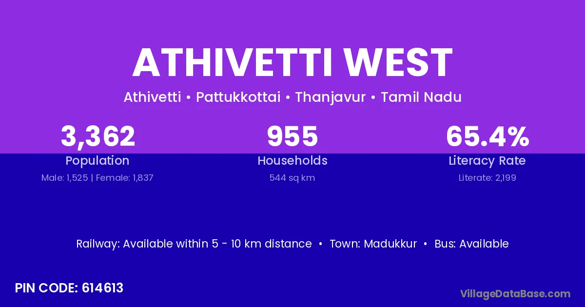 The literacy rate of Athivetti West village is 65.41%. Male literacy stands at 72.85% and female literacy at 59.23%.