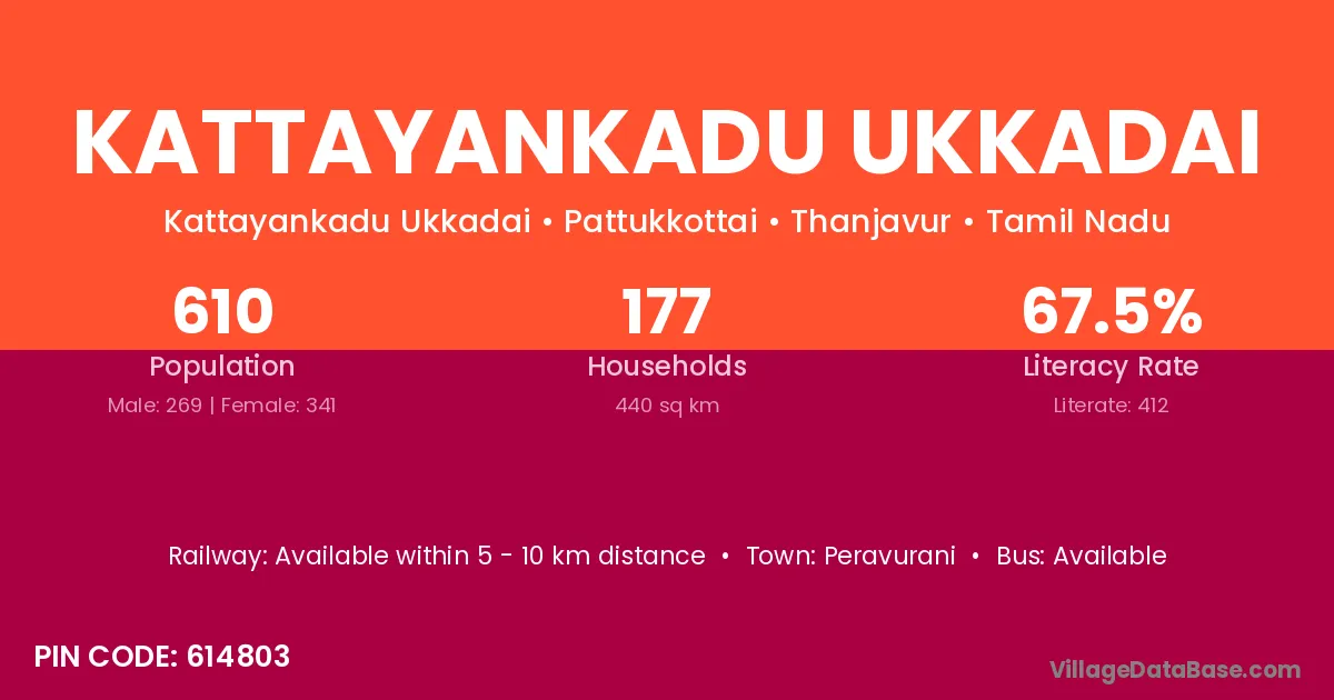 Kattayankadu Ukkadai village has a total population of 610 people, of which 269 are males and 341 are females.