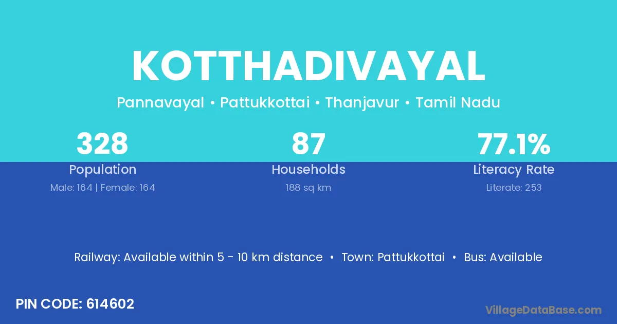 Kotthadivayal village has a total population of 328 people, of which 164 are males and 164 are females.