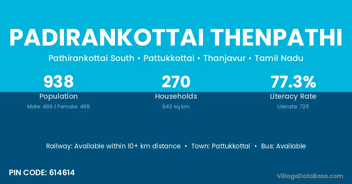 Padirankottai Thenpathi village has a total population of 938 people, of which 469 are males and 469 are females.