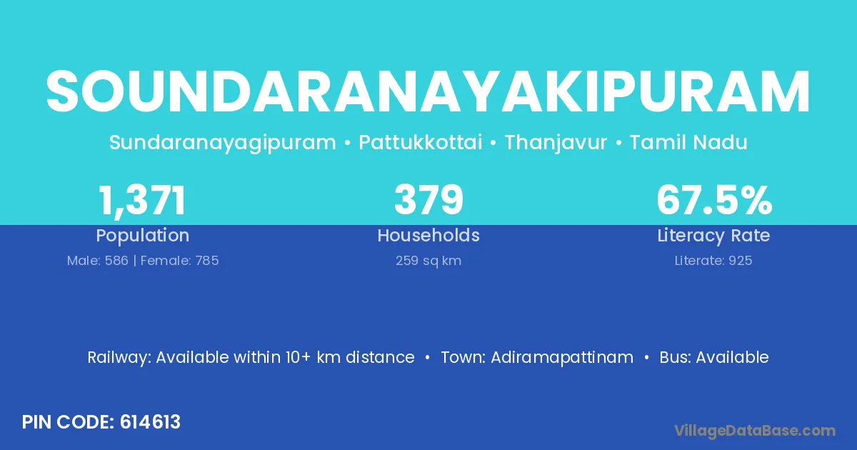 Soundaranayakipuram village has a total population of 1,371 people, of which 586 are males and 785 are females.