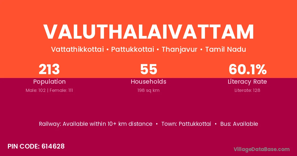 Valuthalaivattam village has a total population of 213 people, of which 102 are males and 111 are females.