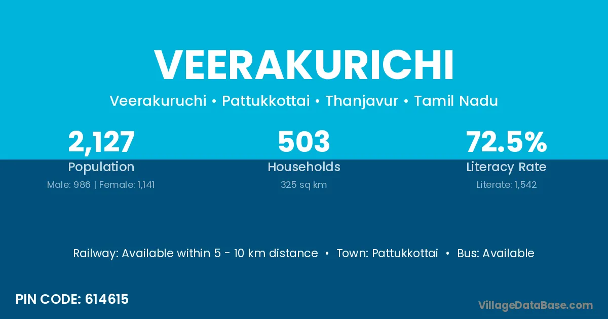 Veerakurichi village has a total population of 2,127 people, of which 986 are males and 1,141 are females.