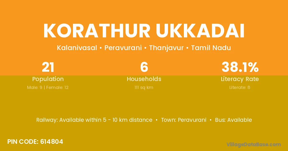 Korathur Ukkadai village has a total population of 21 people, of which 9 are males and 12 are females.