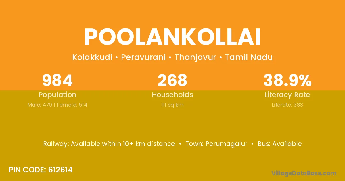 Poolankollai village has a total population of 984 people, of which 470 are males and 514 are females.