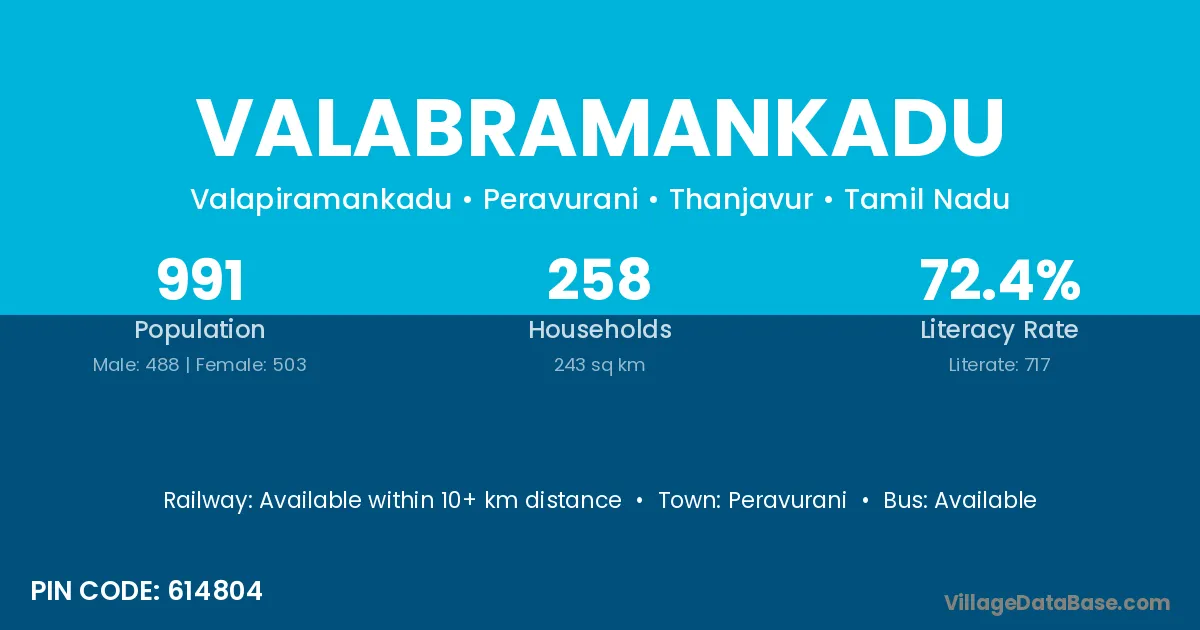 Valabramankadu village has a total population of 991 people, of which 488 are males and 503 are females.