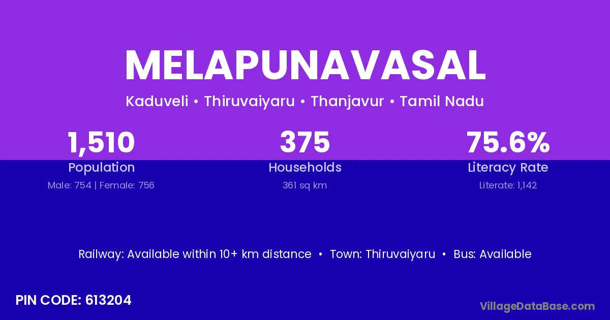Melapunavasal village has a total population of 1,510 people, of which 754 are males and 756 are females.