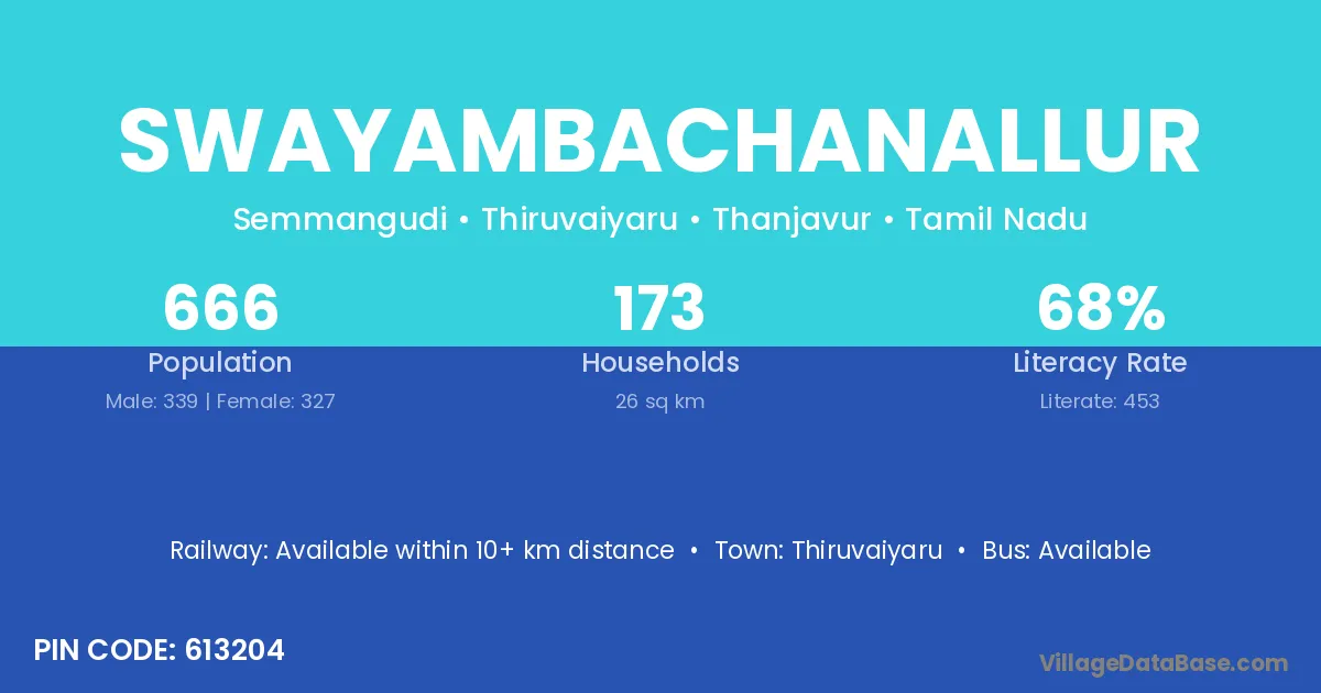 Swayambachanallur village has a total population of 666 people, of which 339 are males and 327 are females.