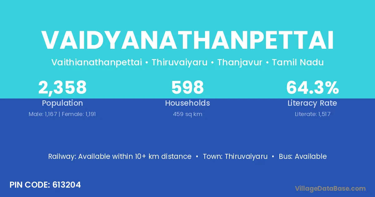 Vaidyanathanpettai village has a total population of 2,358 people, of which 1,167 are males and 1,191 are females.