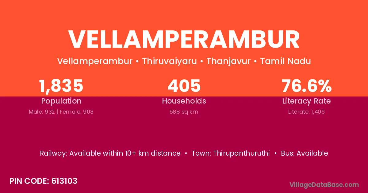 Vellamperambur village has a total population of 1,835 people, of which 932 are males and 903 are females.
