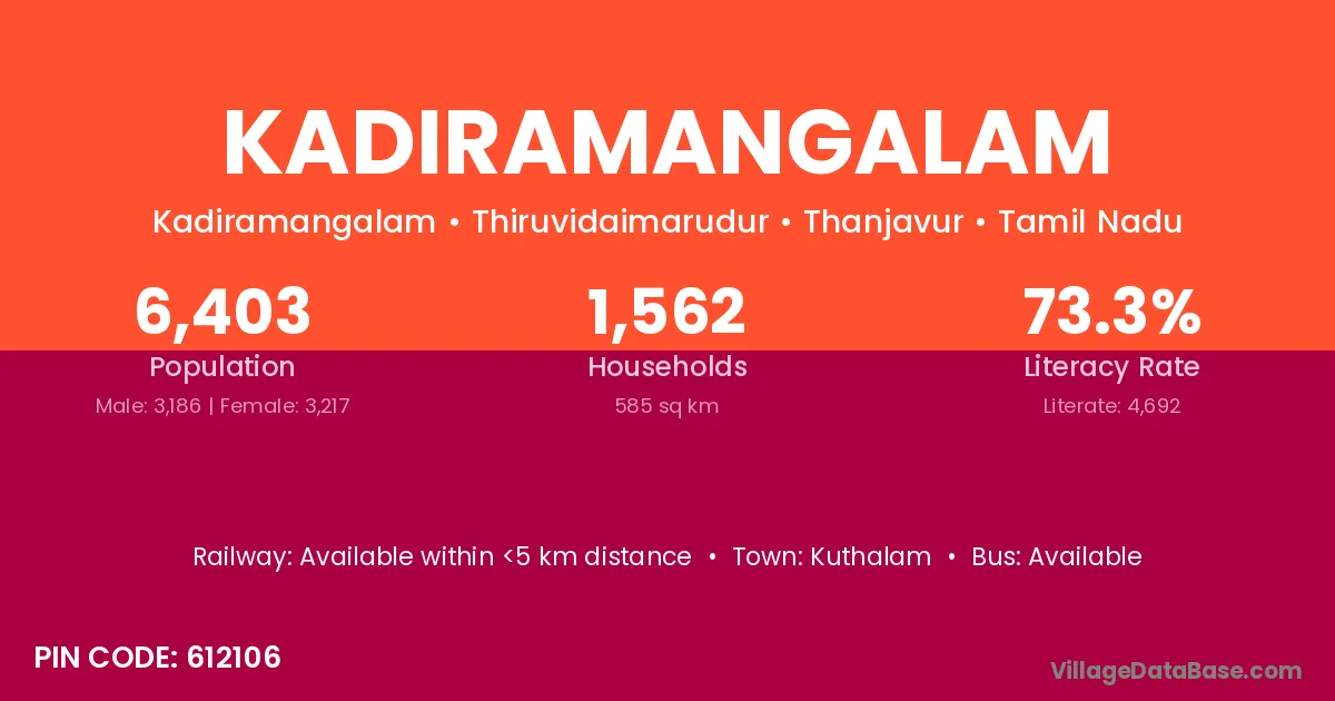 Kadiramangalam village has a total population of 6,403 people, of which 3,186 are males and 3,217 are females.