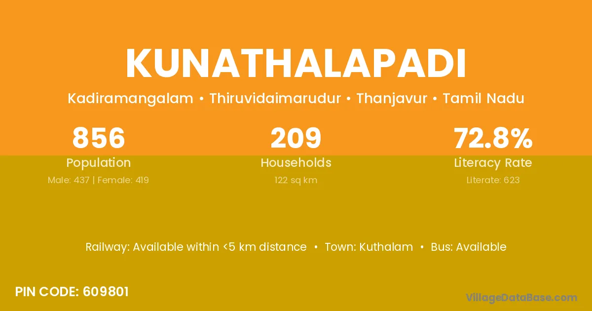 Kunathalapadi village has a total population of 856 people, of which 437 are males and 419 are females.