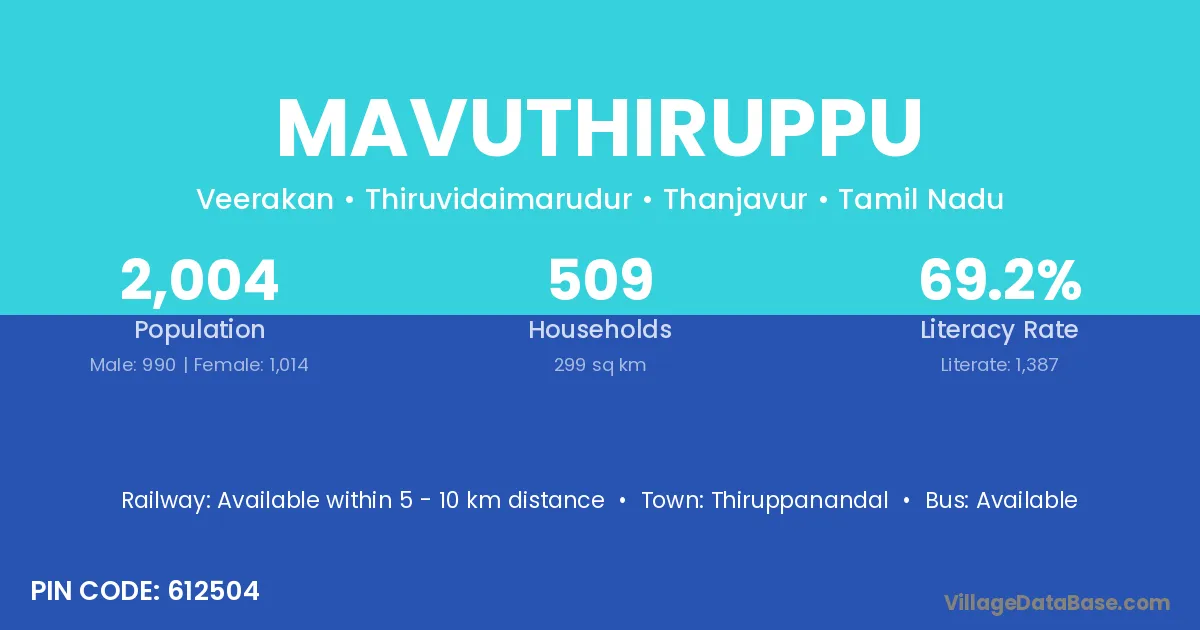 Mavuthiruppu village has a total population of 2,004 people, of which 990 are males and 1,014 are females.