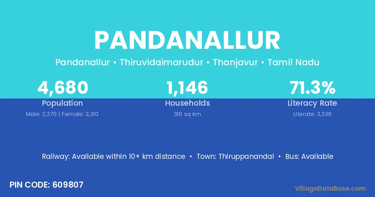 Pandanallur village has a total population of 4,680 people, of which 2,370 are males and 2,310 are females.