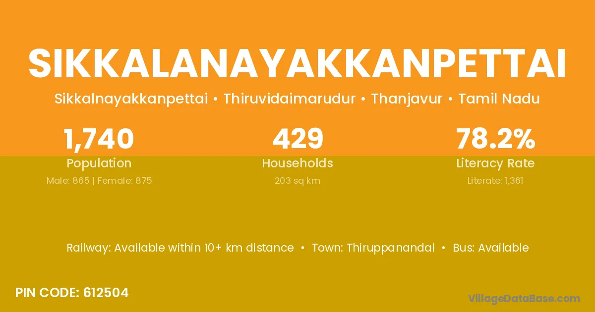 Sikkalanayakkanpettai village has a total population of 1,740 people, of which 865 are males and 875 are females.