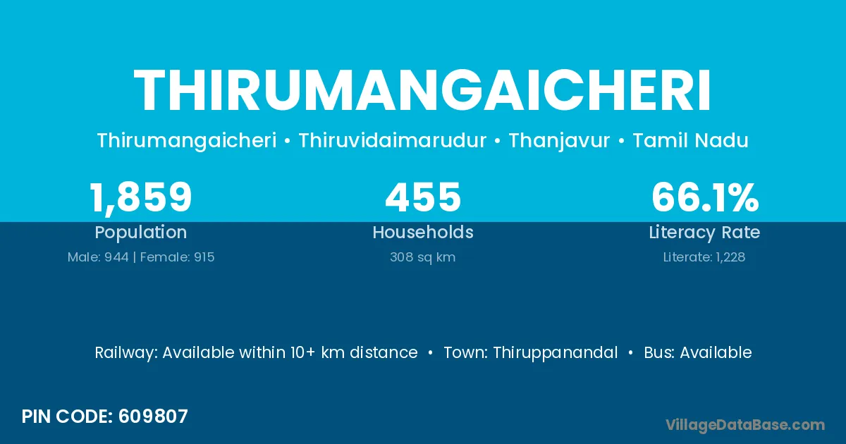 Thirumangaicheri village has a total population of 1,859 people, of which 944 are males and 915 are females.