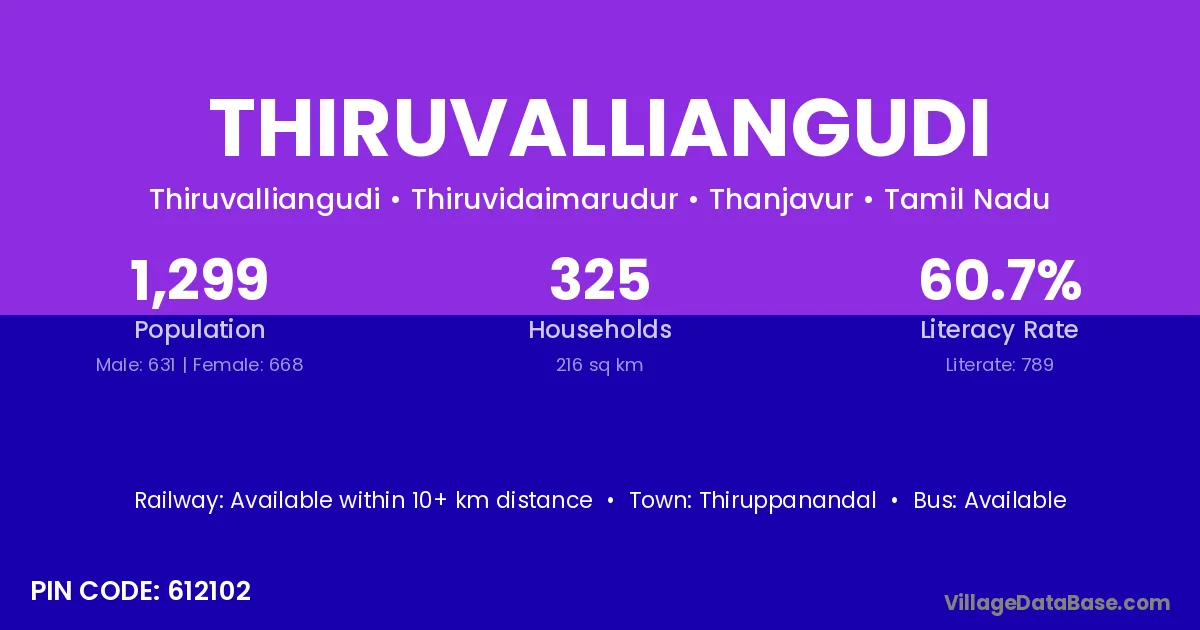 Thiruvalliangudi village has a total population of 1,299 people, of which 631 are males and 668 are females.