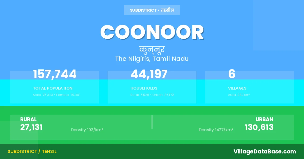 According to the 2011 census The total area of Coonoor Taluka is 232 km², with a population of 157744 people. The population density is 679 inhabitants per square kilometre, and there are approximately 44197 houses in the sub district.