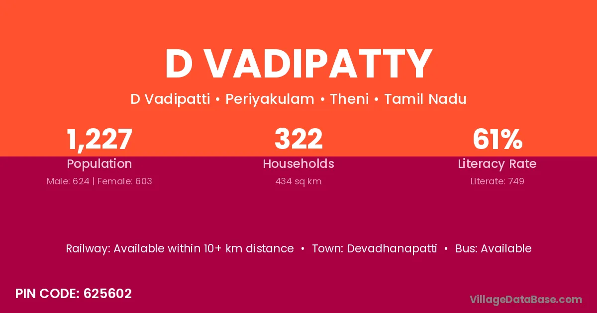 D Vadipatty village has a total population of 1,227 people, of which 624 are males and 603 are females.