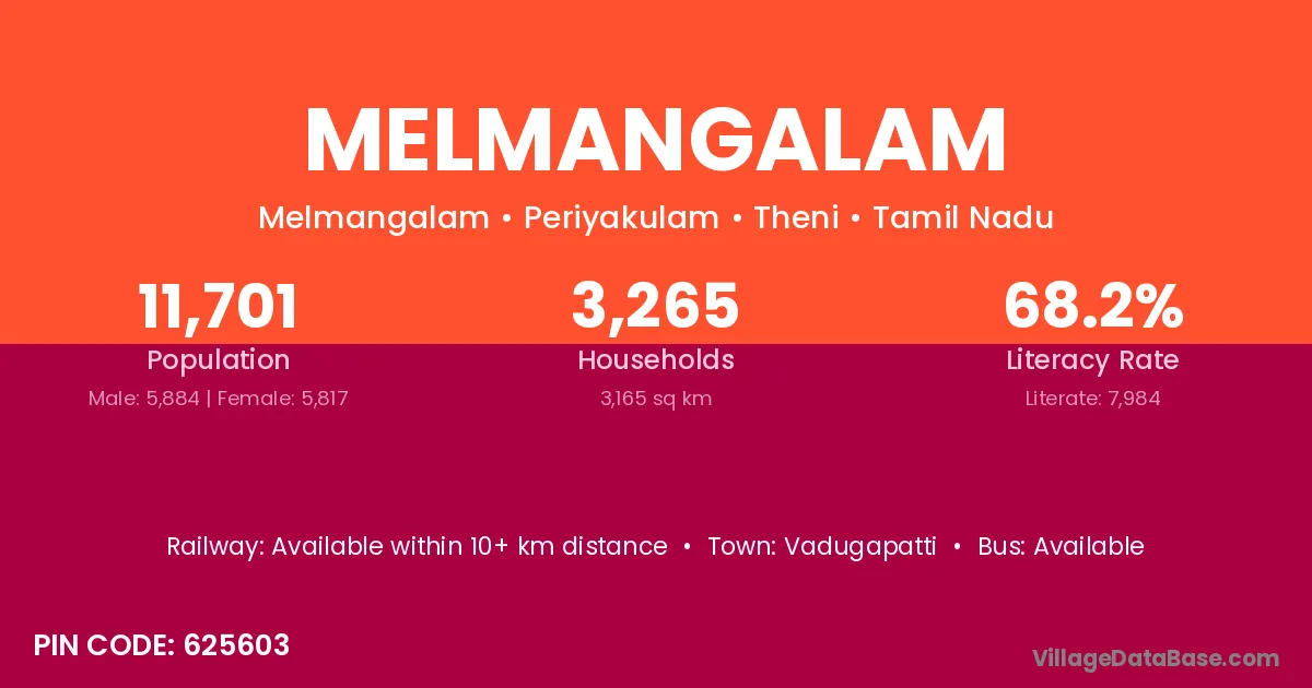 There are approximately 3,265 households in Melmangalam village.
