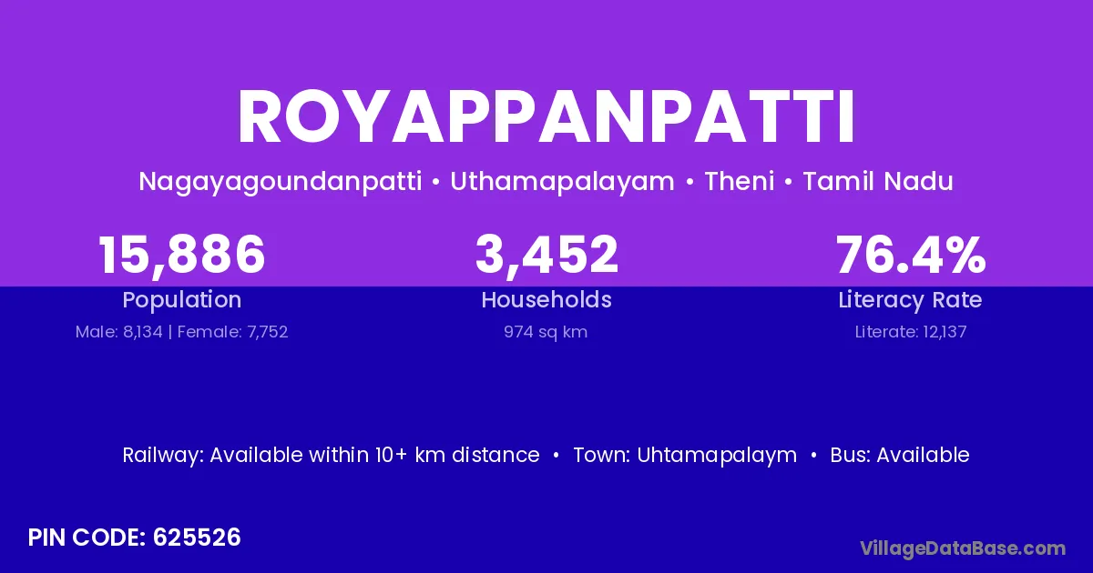 Royappanpatti village has a total population of 15,886 people, of which 8,134 are males and 7,752 are females.
