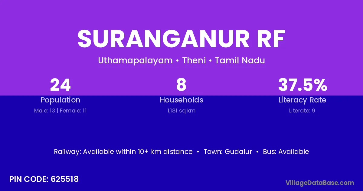 Suranganur Rf village has a total population of 24 people, of which 13 are males and 11 are females.