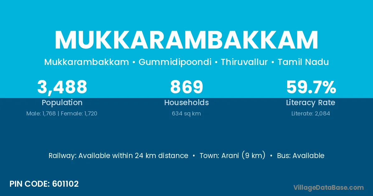 Mukkarambakkam village has a total population of 3,488 people, of which 1,768 are males and 1,720 are females.