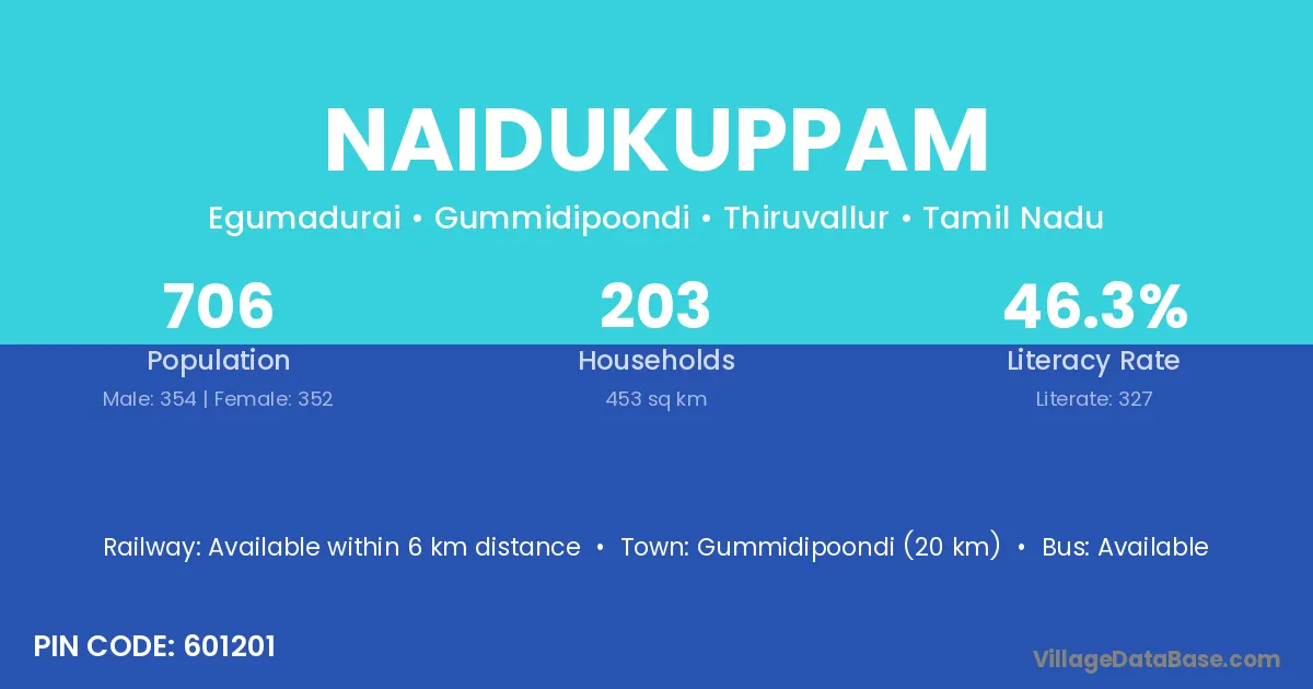 Gummidipoondi (20 km) is the nearest town to Naidukuppam village for major economic activities and is located approximately 20 km away.